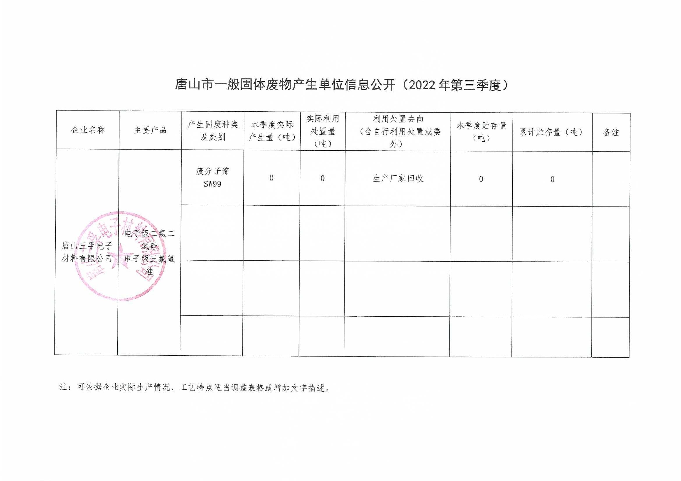 唐山三孚電子材料有限公司2022年第三季度一般固體廢物信息公開