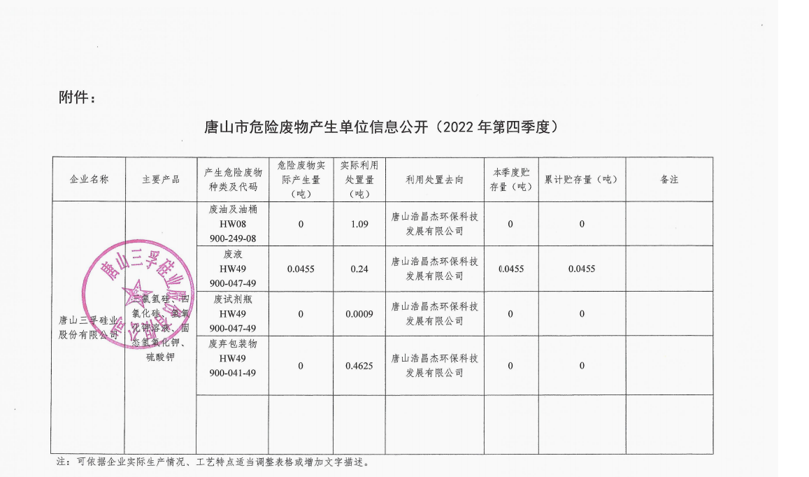 唐山三孚硅業(yè)股份有限公司2022年第四季度危險廢物信息公開